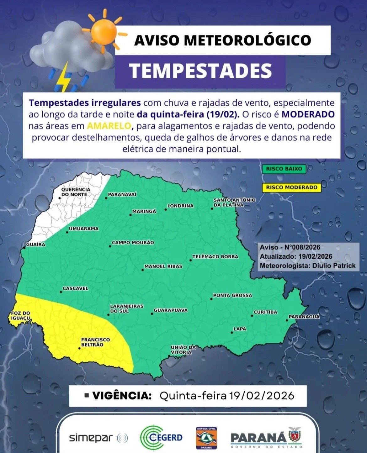 Defesa Civil emite aviso de tempestades e coloca Quatro Pontes em área de risco moderado