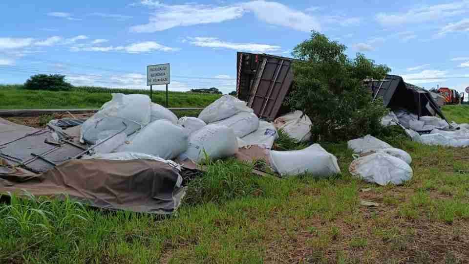 Carreta tomba e espalha fertilizantes às margens da BR 163