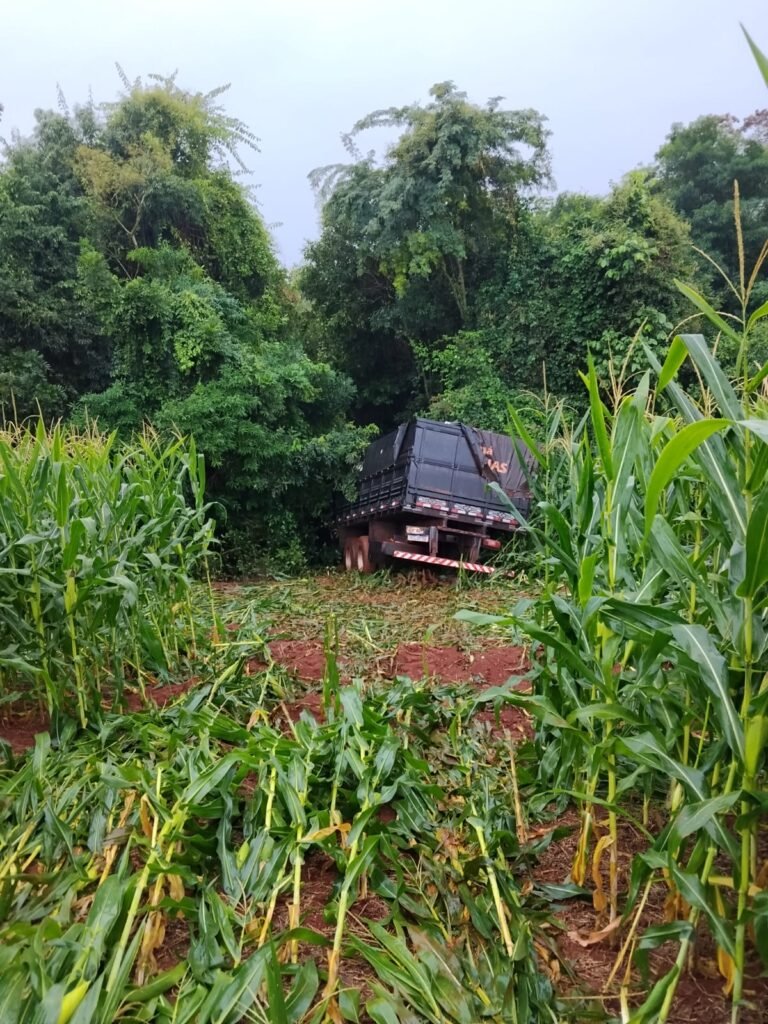 As imagens enviadas mostram o caminhão em meio à plantação, com sinais de danos na vegetação, além de indícios da carga transportada. A suspeita é de que o material seja oriundo de contrabando de cigarros do Paraguai, prática recorrente na região de fronteira.