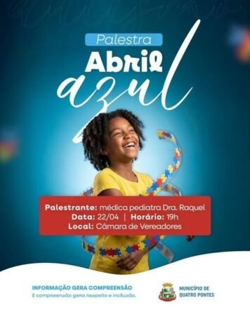 A Prefeitura de Quatro Pontes, em uma iniciativa voltada à promoção da empatia e do conhecimento, convida toda a comunidade para uma palestra especial em alusão ao Abril Azul — mês dedicado mundialmente à conscientização sobre o Transtorno do Espectro Autista (TEA).