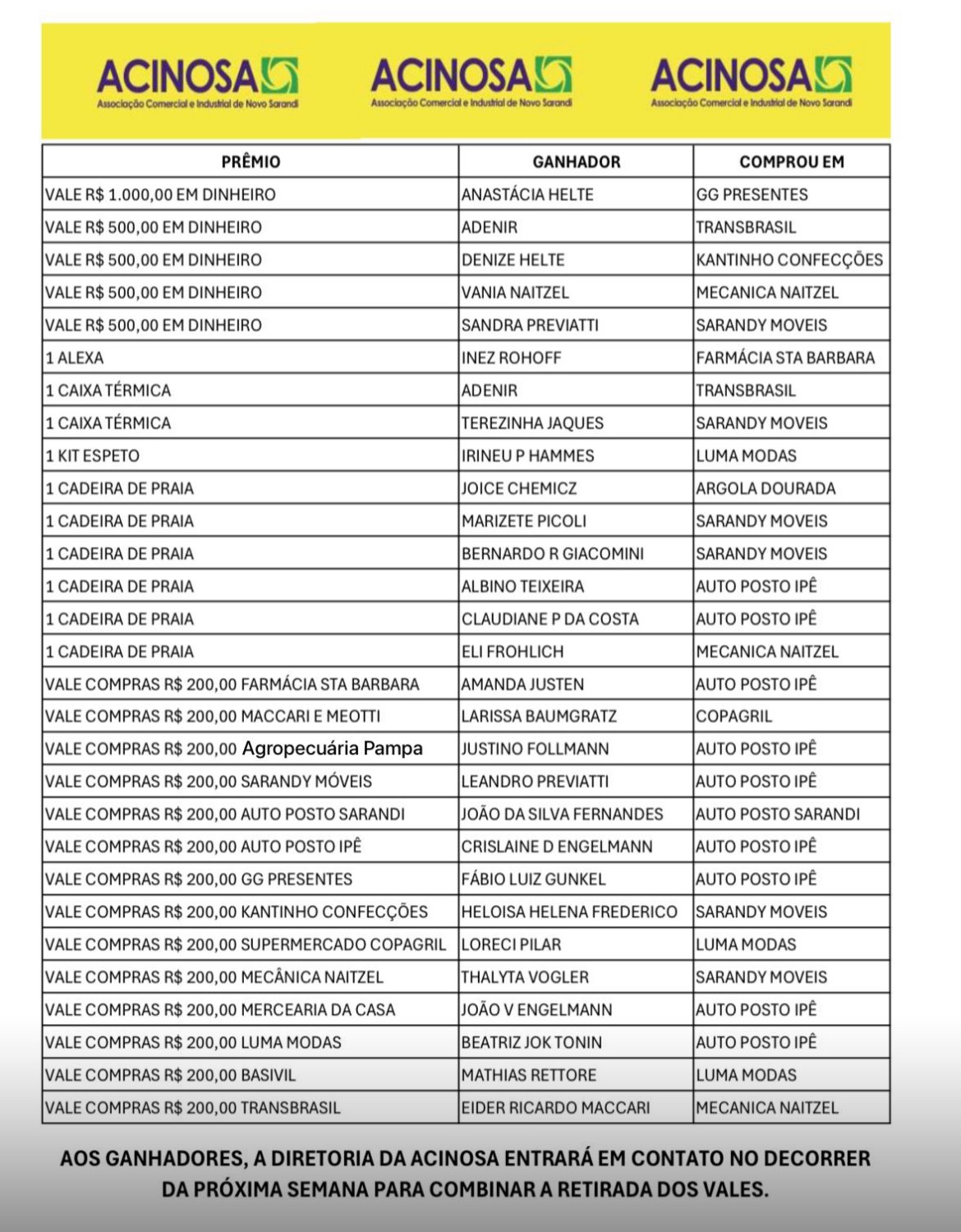 A diretoria da ACINOSA informa que entrará em contato com todos os ganhadores ao longo da próxima semana para orientar sobre a retirada dos vales e prêmios.