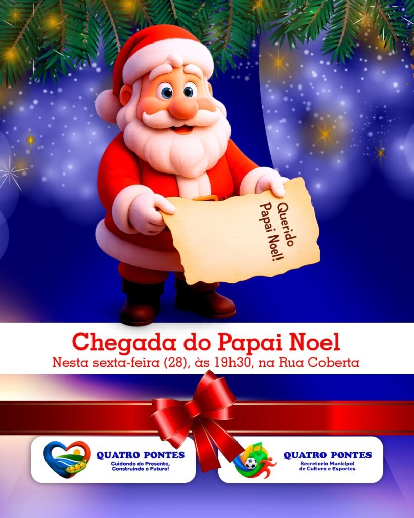 A magia do Natal chega a Quatro Pontes nesta sexta-feira (28), a partir das 19h30, na Rua Coberta, com a abertura oficial da festa natalina. O destaque desta edição especial é o voucher entregue aos alunos da cidade, que deve ser apresentado ao Papai Noel para a retirada de um pacotinho de Natal repleto de surpresas.