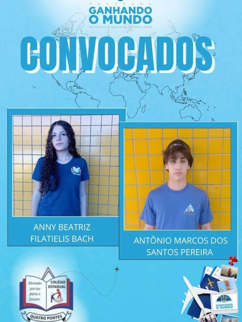 O Colégio Estadual Quatro Pontes tem orgulho em anunciar que seus alunos Antônio Marcos e Anny Beatriz foram selecionados para o programa Ganhando o Mundo, uma iniciativa de intercâmbio internacional promovida pelo Governo do Paraná.