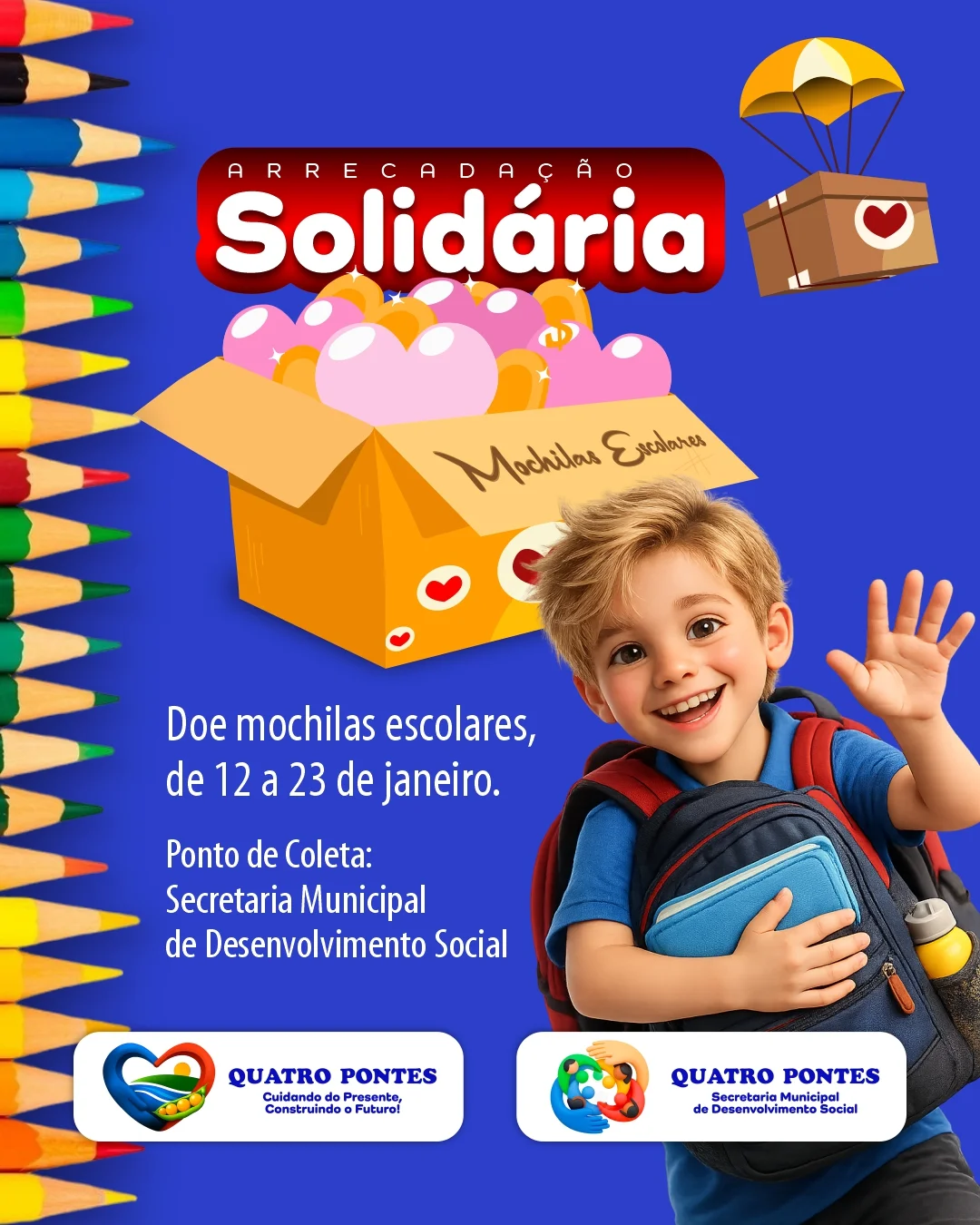 A Prefeitura de Quatro Pontes, por meio da Secretaria Municipal de Desenvolvimento Social, está realizando a Arrecadação Solidária de Mochilas, iniciativa voltada ao apoio de crianças pertencentes a famílias em situação de vulnerabilidade social, atendidas pelos serviços do Centro de Referência de Assistência Social (CRAS).
