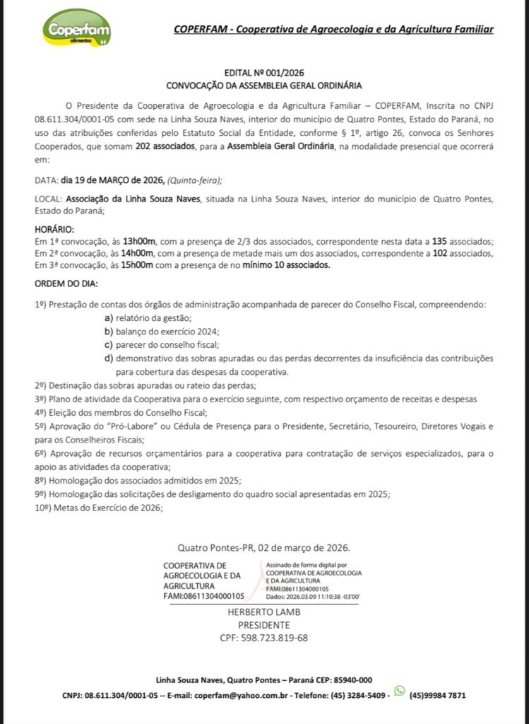 A Cooperativa de Agroecologia e da Agricultura Familiar (Coperfam), com sede na Linha Souza Naves, interior de Quatro Pontes, publicou o edital de convocação para a realização da Assembleia Geral Ordinária da entidade.