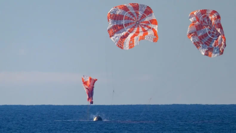 Durante a reentrada, a cápsula acionou os paraquedas para reduzir a velocidade antes do pouso. Ao todo, a descida até o oceano Pacífico levou cerca de 13 minutos.