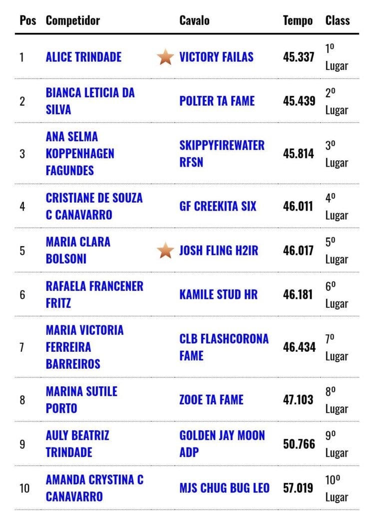 Competindo na categoria 2D, Bianca Letícia Eggers Silva conquistou o título de vice-campeã da Expovel 2025, com o cavalo Polter Ta Fame, registrando o tempo de 45.439 segundos — resultado que a colocou na 2ª colocação geral da divisão.