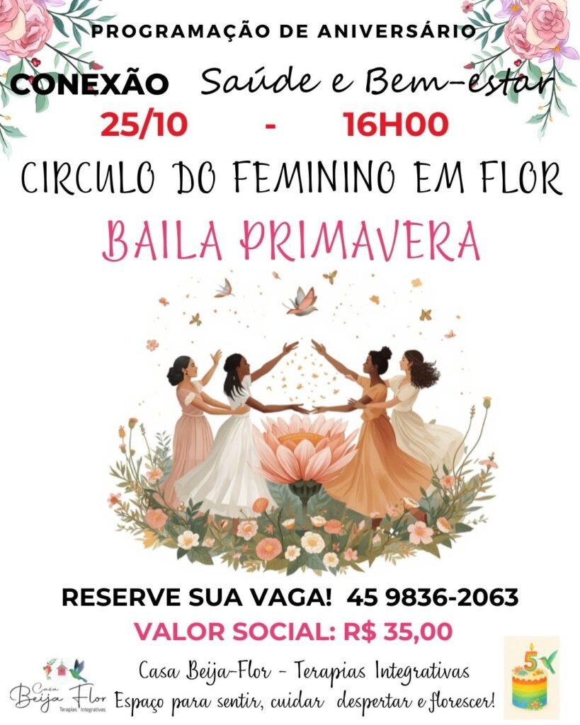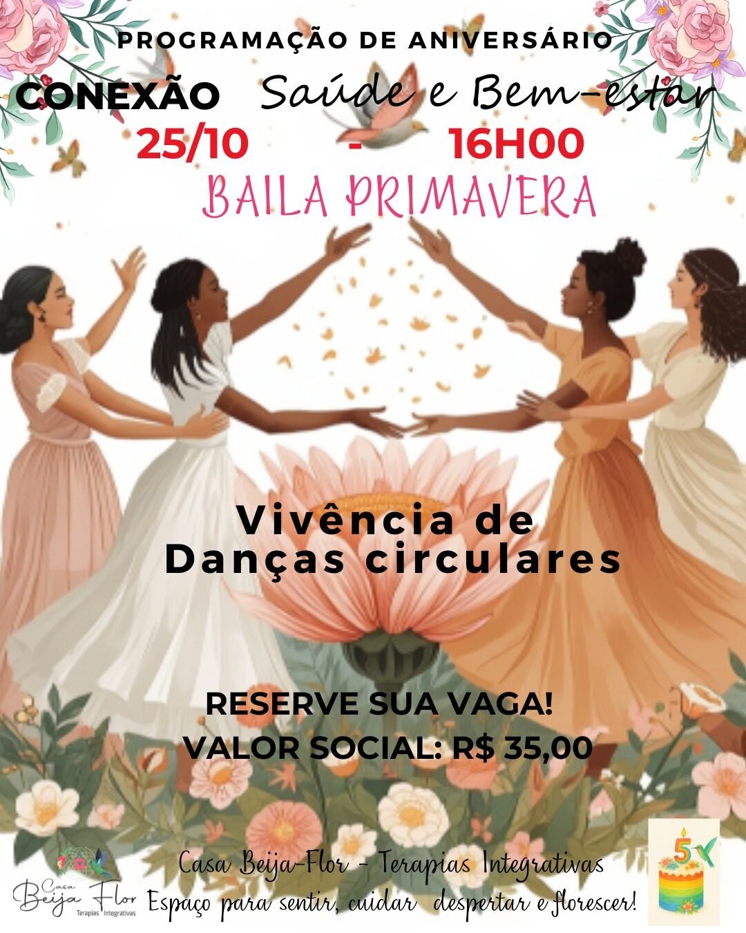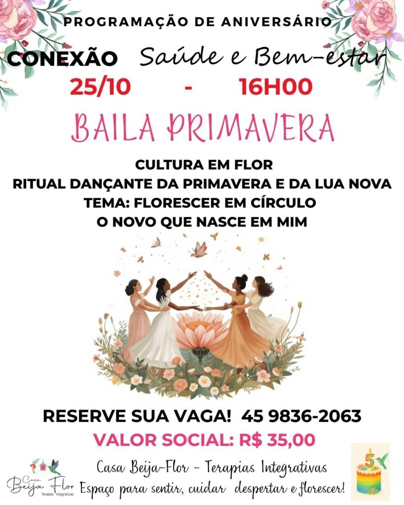 Neste sábado, dia 25 de outubro, a Casa Beija-Flor Terapias Integrativas abre suas portas para um encontro de alma, movimento e celebração: o Baila Primavera — Cultura em Flor, um Ritual Dançante da Primavera e da Lua Nova que convida o público a dançar com a estação do despertar e celebrar o florescimento interior.