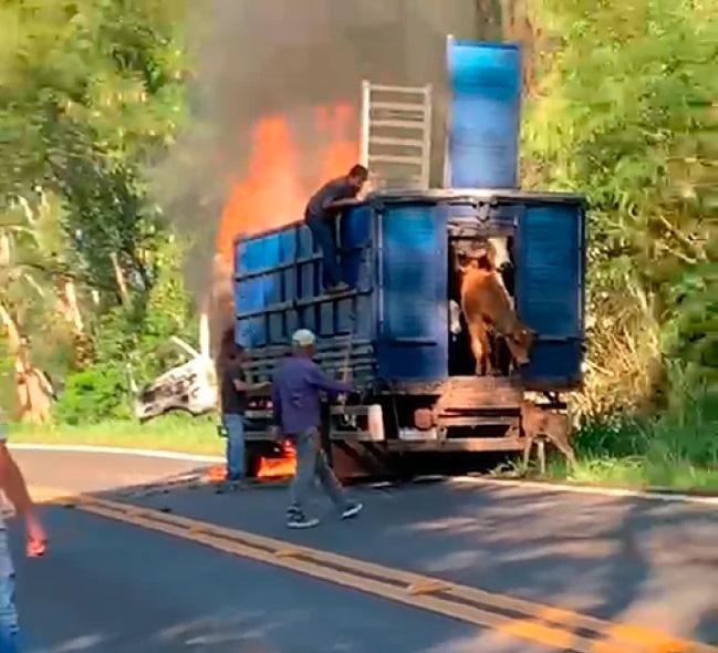 O veículo transportava bovinos, que foram retirados a tempo e não sofreram ferimentos. O motorista conseguiu parar o caminhão no acostamento e pedir ajuda enquanto outros condutores colaboravam para abrir a carroceria e liberar os animais.