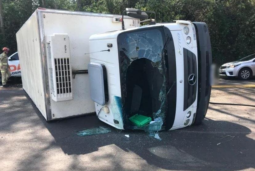 O motorista do caminhão Ford Cargo seguia pela rodovia, quando na curva próximo ao Batalhão de Polícia de Fronteira (BPFron) acabou perdendo o controle do veículo e tombando no meio da pista.