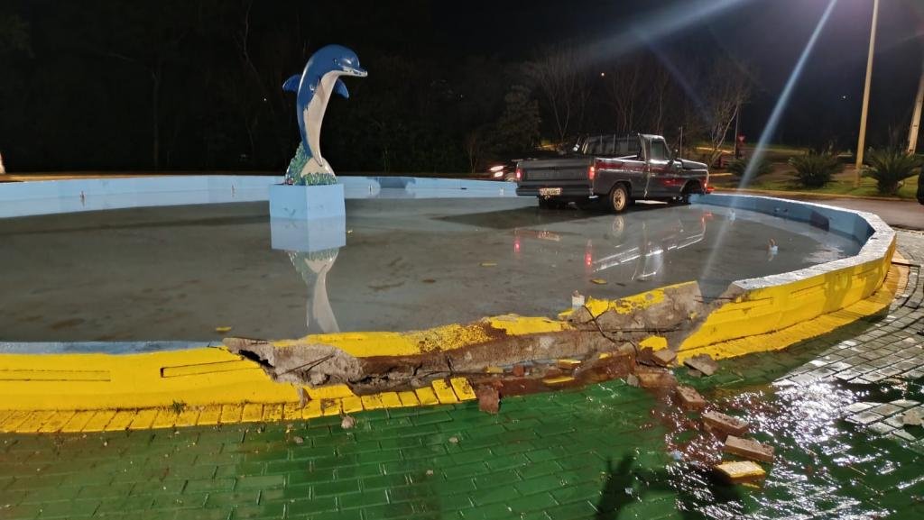 Segundo informações apuradas no local, o motorista seguia pela Rua Alemanha quando perdeu o controle da direção ao acessar a rotatória. O veículo atingiu a mureta do chafariz conhecido como “chafariz do golfinho” e acabou parando dentro da estrutura.