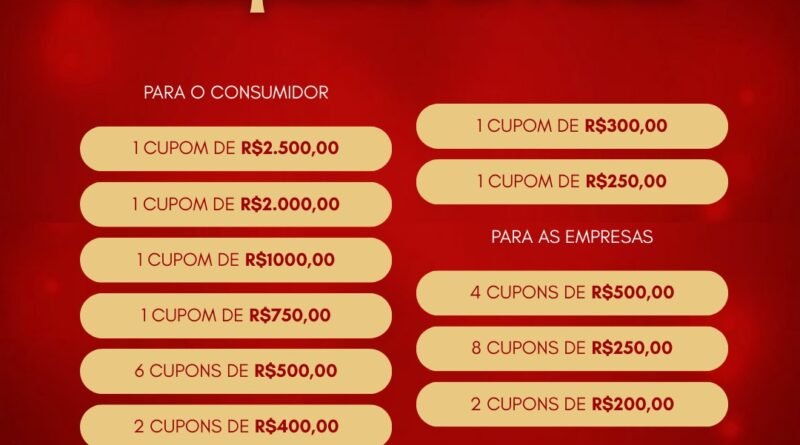 Os prêmios variam de R$ 2.500,00 a R$ 250,00 para consumidores, com valores proporcionais para as empresas onde os cupons premiados estiverem cadastrados.