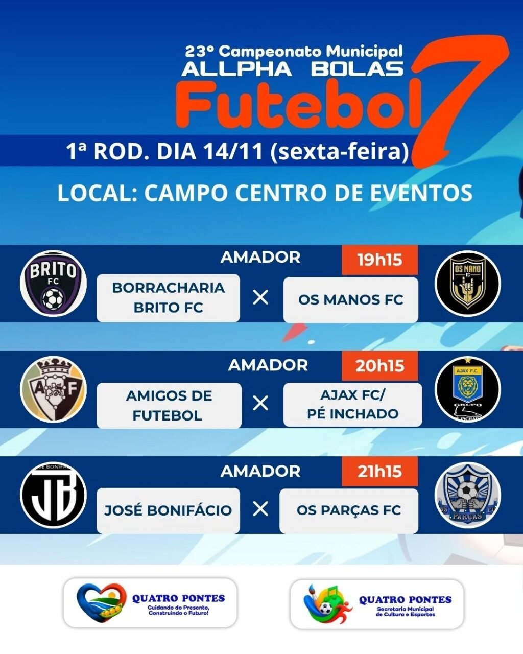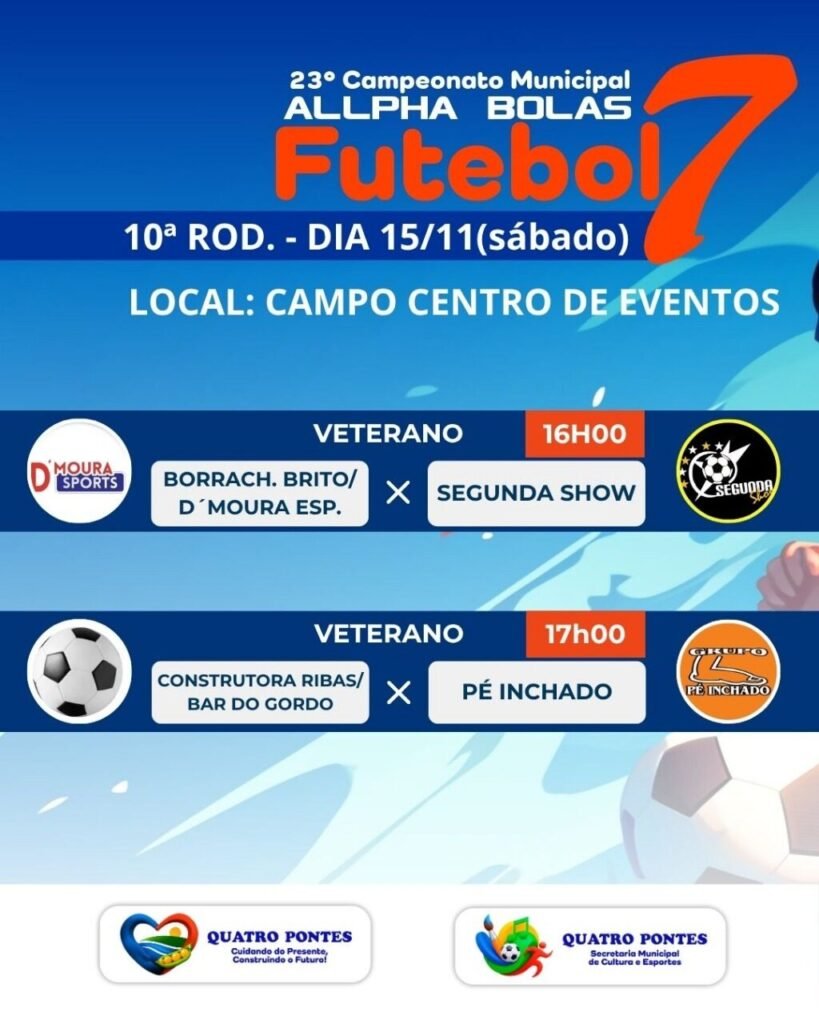 O 23º Campeonato Municipal Allpha Bolas de Futebol Sete de Quatro Pontes entra em mais um fim de semana de muita bola rolando e grandes confrontos nas categorias Amador e Veterano. As partidas acontecem no Campo do Centro de Eventos, reunindo atletas e torcedores em clima de integração e competição saudável.