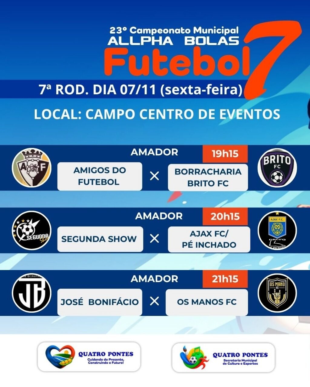 O Campeonato Municipal Allpha Bolas de Futebol Sete de Quatro Pontes segue movimentando o esporte local com mais uma rodada repleta de grandes confrontos. As partidas acontecem nesta sexta-feira (7) e sábado (8), reunindo equipes das categorias Amador e Veterano.