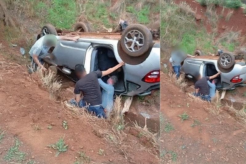 Carro capota e para com as rodas para cima na entrada de Nova Santa Rosa