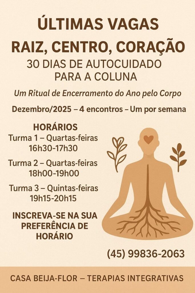 A Casa Beija-Flor – Terapias Integrativas está com as últimas vagas disponíveis para o programa “Raiz, Centro e Coração: 30 Dias de Autocuidado para a Coluna”, projeto piloto que será realizado ao longo de dezembro em Quatro Pontes. A proposta é oferecer um encerramento de ano mais leve, saudável e emocionalmente claro para quem busca equilibrar corpo e mente.