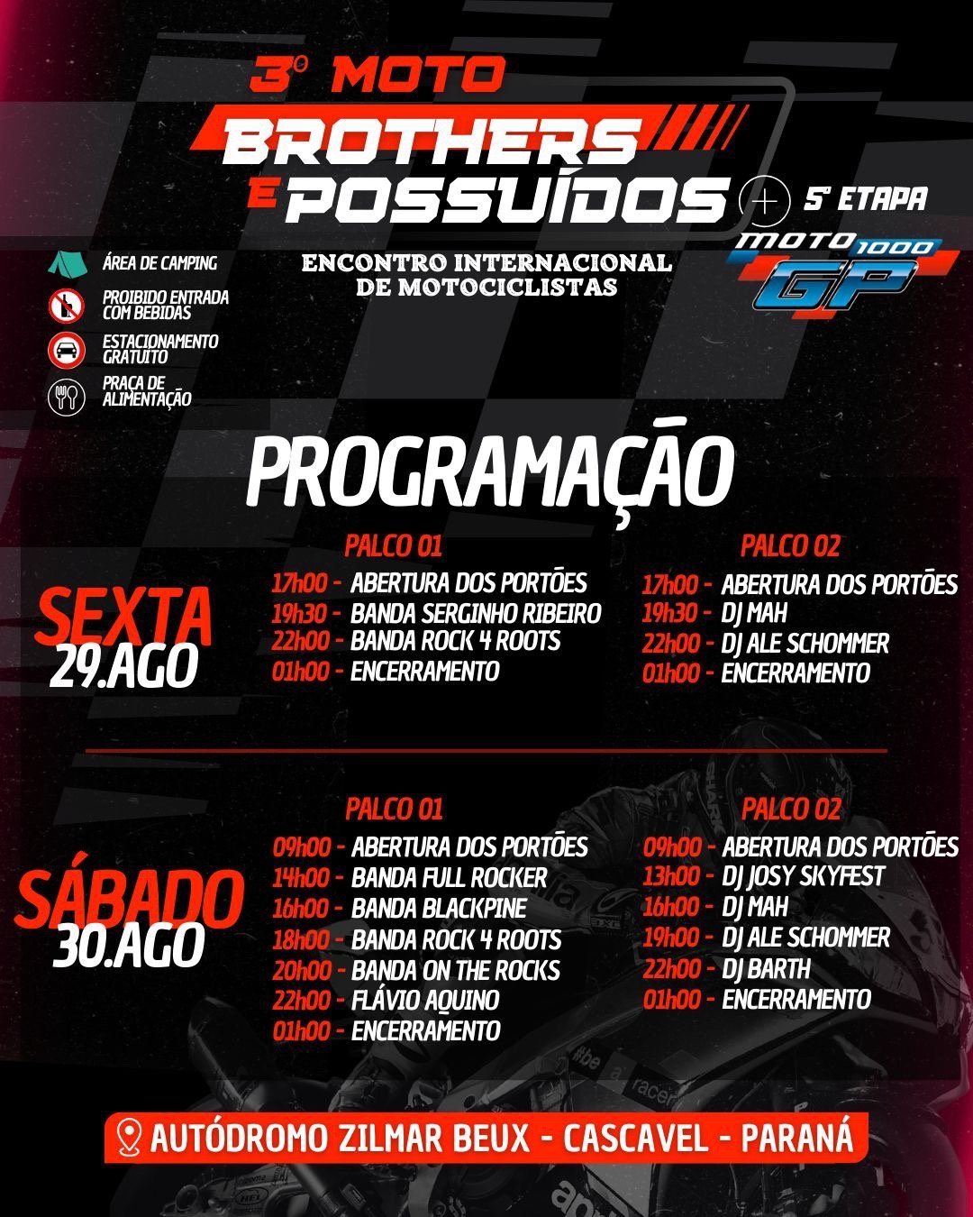Cascavel será palco de um grande encontro de motociclistas neste fim de semana. O 3º Moto Brothers e Possuídos – Encontro Internacional de Motociclistas promete movimentar a cidade entre os dias 29 e 30 de agosto, no Autódromo Zilmar Beux.