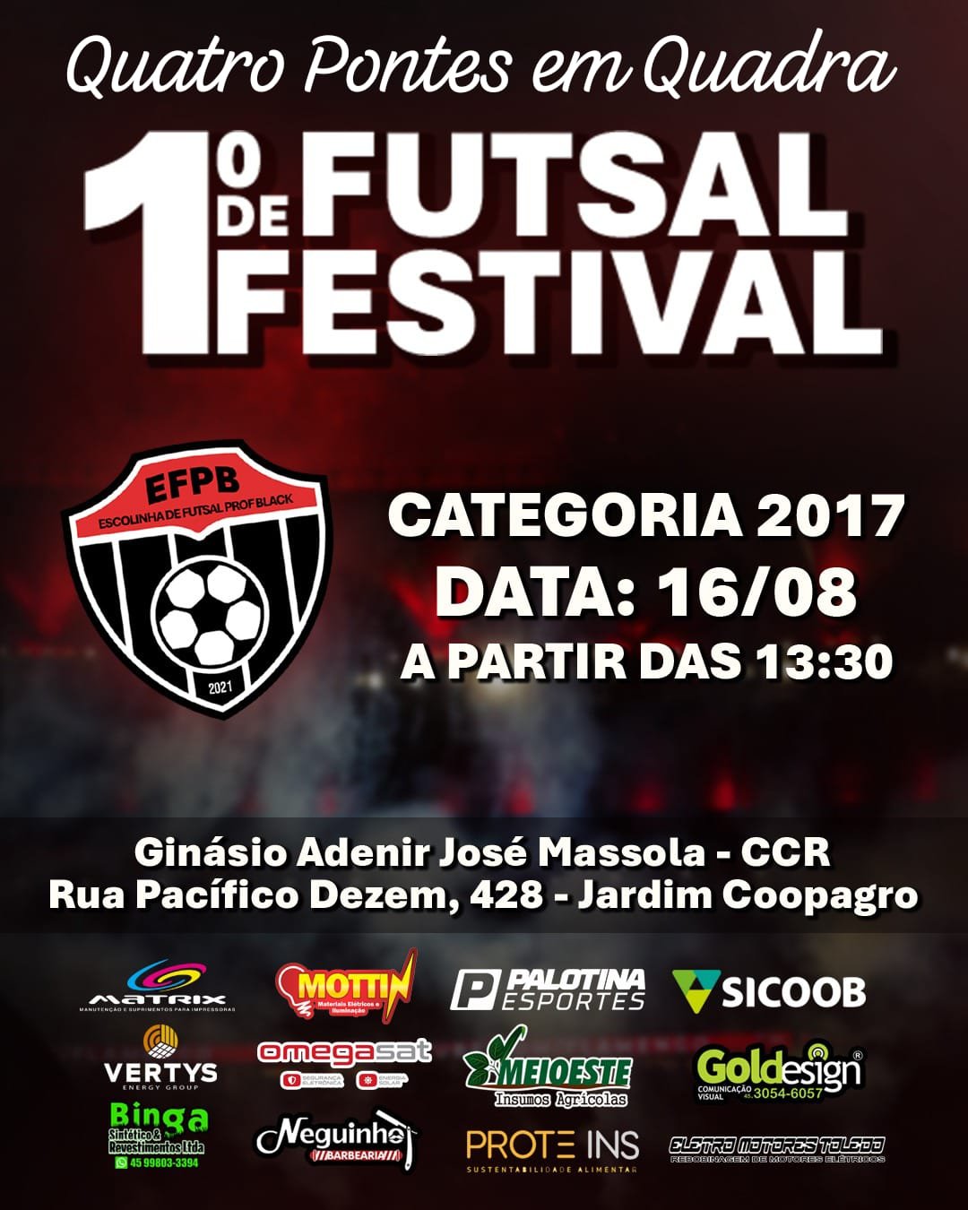 A equipe de futsal de Quatro Pontes, categoria 2017, estará em ação neste sábado, 16 de agosto, participando do 1º Festival de Futsal EFPB 2025, realizado em Toledo.