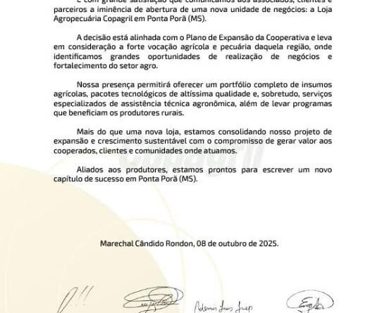 Ler MaisA Cooperativa Agroindustrial Copagril segue avançando no Mato Grosso do Sul e anunciou, nesta quarta-feira (8), a abertura de uma