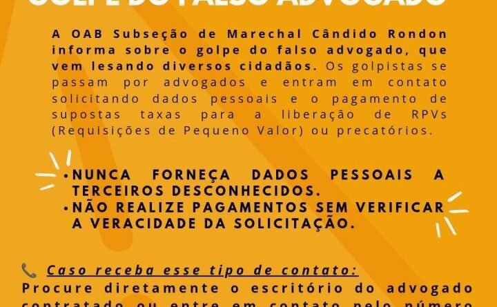 Ler MaisA OAB, Subseção de Marechal Cândido Rondon, está emitindo um alerta para toda a população sobre um golpe que tem