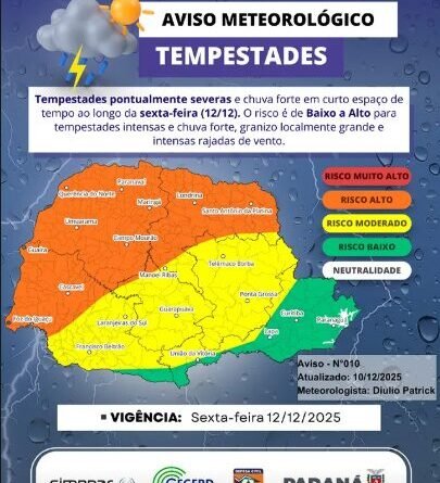 Ler MaisA Defesa Civil e o Simepar emitiram um aviso de tempestades intensas para sexta-feira (12/12) e também para o sábado