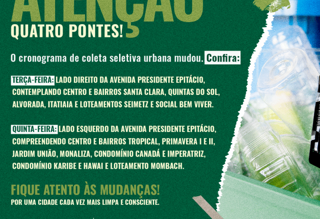 Ler MaisA Prefeitura de Quatro Pontes, através da Secretaria de Desenvolvimento Econômico, alterou a coleta seletiva urbana, implantando um novo sistema