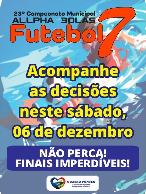 O Campeonato Municipal Allpha Bolas de Futebol Sete de Quatro Pontes chega ao seu capítulo final neste sábado (06), com três partidas que prometem fortes emoções e arquibancadas cheias no Campo Centro de Eventos.