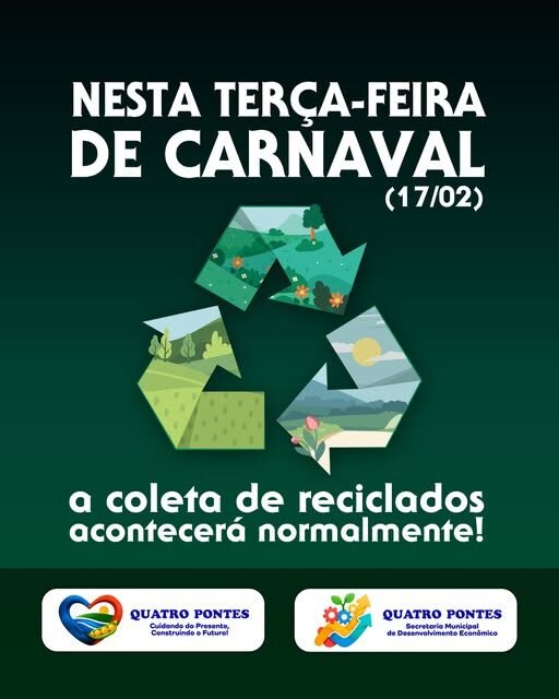 O Município de Quatro Pontes informa que a coleta de reciclados ocorrerá normalmente na próxima terça-feira, dia 17 de fevereiro, mesmo sendo feriado de Carnaval.