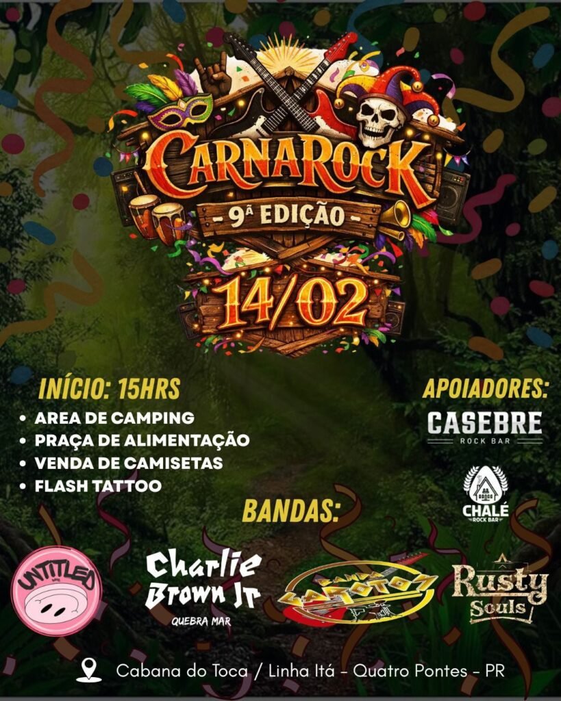 No sábado (14), acontece a 9ª edição do CarnaRock, a partir das 15h, na Cabana do Toca na Linha Itá.