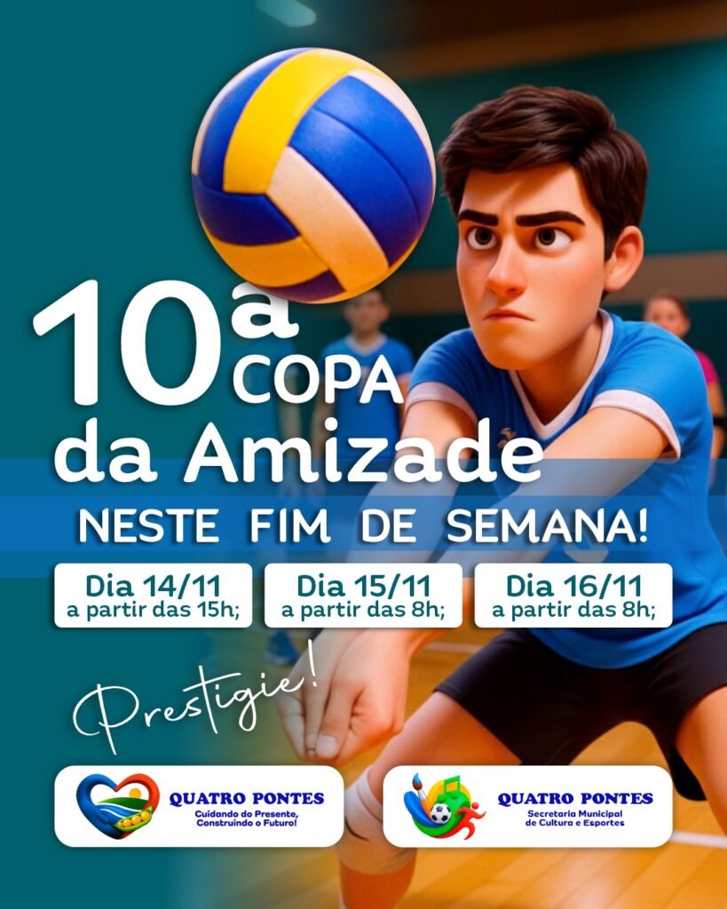 A Secretaria Municipal de Cultura e Esportes de Quatro Pontes informa que o município sediará, entre os dias 14 e 16 de novembro, a 10ª Copa Amizade de Voleibol, na categoria Sub-17, nas modalidades masculina e feminina. A etapa integra o calendário regional da competição e reunirá equipes de sete municípios.