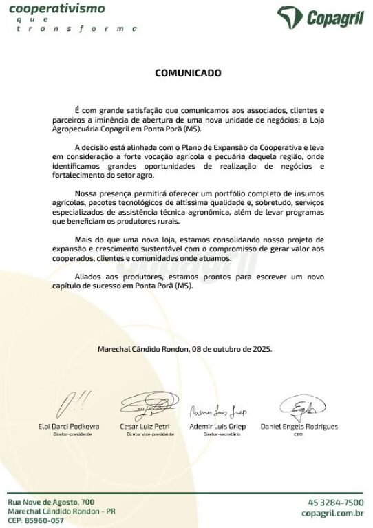 Com mais essa expansão, a Copagril reforça sua presença no Mato Grosso do Sul e reafirma seu propósito de unir produtividade, tecnologia e sustentabilidade, pautada pelos valores do cooperativismo, que transformam realidades e impulsionam o desenvolvimento do campo.