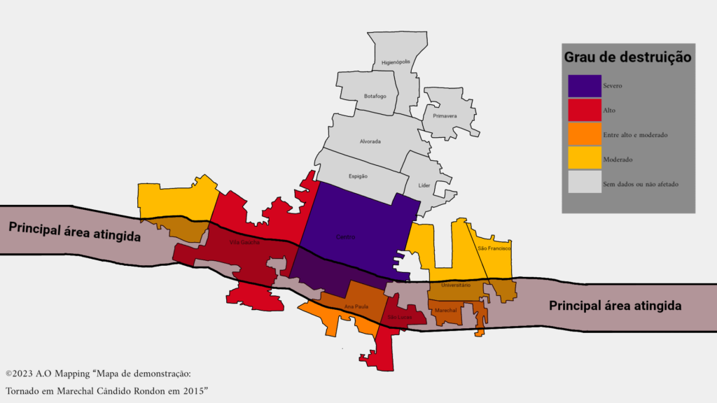 O Simepar destacou que o tornado teve atuação breve, mas intensa, deslocando-se entre Marechal Rondon e Quatro Pontes, deixando um corredor de destruição.