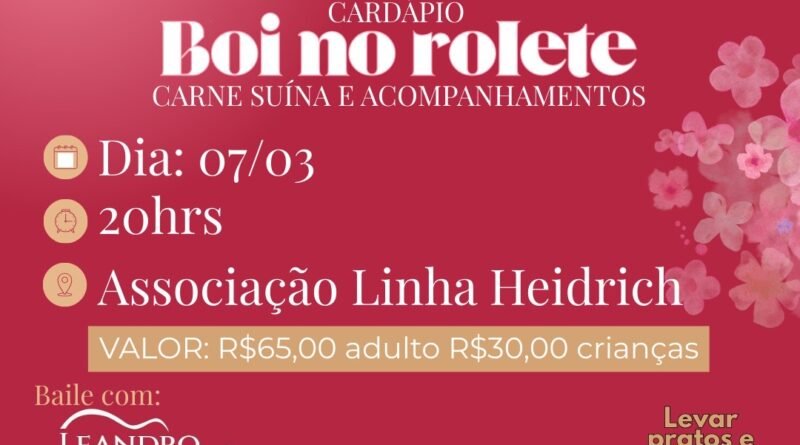 O evento é promovido pelo Rotary Club de Marechal Cândido Rondon, em parceria com a Associação de Moradores e o Clube de Mães da Linha Heidrich, e será realizado no dia 7 de março, a partir das 20 horas, na Linha Heidrich, em Marechal Cândido Rondon.