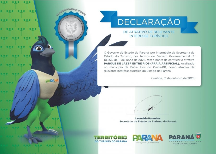 O município de Entre Rios do Oeste recebeu uma importante conquista: a Classificação Prata de Atrativo de Relevante Interesse Turístico, concedida pelo Governo do Estado do Paraná. Essa distinção foi atribuída ao Parque de Lazer de Entre Rios, (praia artificial).