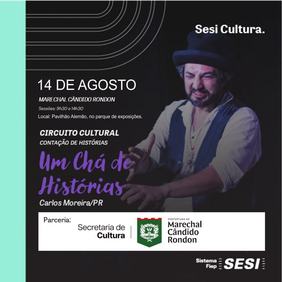 Em uma parceria entre a Secretaria de Cultura de Marechal Cândido Rondon e o Sesi Cultura, por meio do Circuito Cultural, alunos da rede municipal terão a oportunidade de vivenciar uma experiência teatral única nesta quinta-feira, 14 de agosto. O espetáculo “Um Chá de Histórias”, com o artista Carlos Moreira, será apresentado no Pavilhão Alemão, no Parque de Exposições, em dois horários: às 9h30 e às 14h30.
