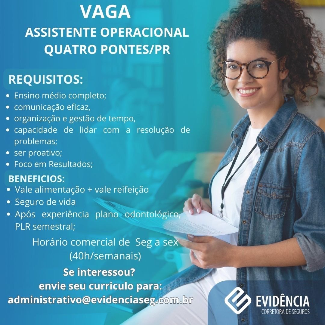 A Evidência Corretora de Seguros, de Quatro Pontes, está com oportunidade de emprego aberta para o cargo de Assistente Operacional, reforçando sua equipe administrativa.