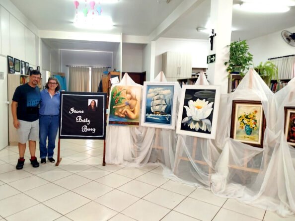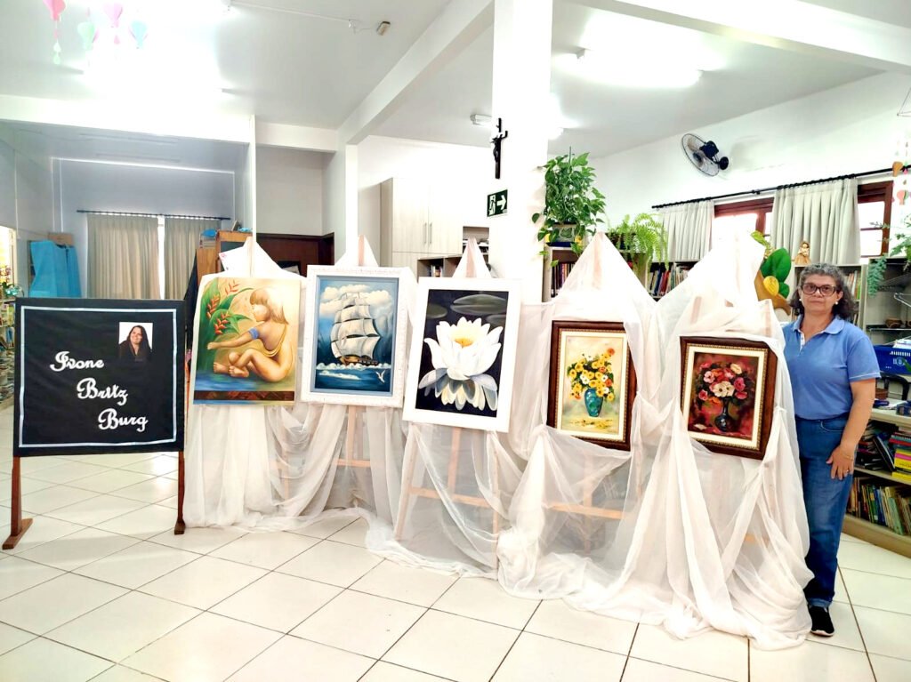 A Biblioteca Municipal, localizada junto à Escola Dona Leopoldina, em Quatro Pontes, recebe desde o dia 7 de abril a exposição de obras da artista local Ivone Britz Burg.