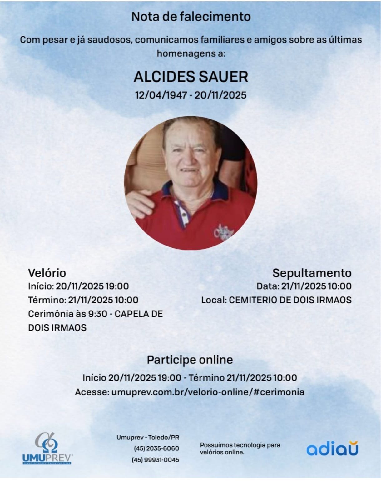 Além de um esposo e pai dedicado, Alcides era presença marcante na comunidade. O sorriso fácil, a educação e o carinho com que tratava todos deixaram um rastro profundo de saudade.
