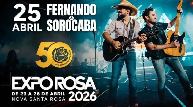 Está confirmada a primeira grande atração da Expo Rosa 2026, evento alusivo aos 50 anos de emancipação político-administrativa de Nova Santa Rosa. A dupla Fernando & Sorocaba subirá ao palco principal no dia 25 de abril, sábado, com entrada gratuita.