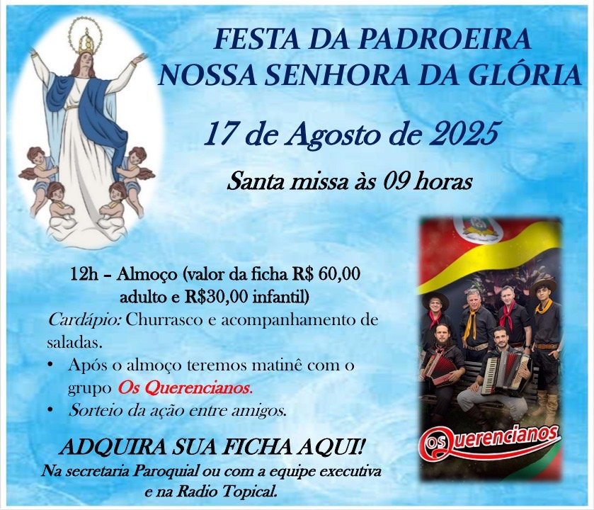 A comunidade católica de Quatro Pontes e região se prepara para celebrar, amanhã, 17 de agosto, a tradicional Festa da Padroeira Nossa Senhora da Glória. O evento promete reunir famílias em um dia de fé, confraternização e alegria.
