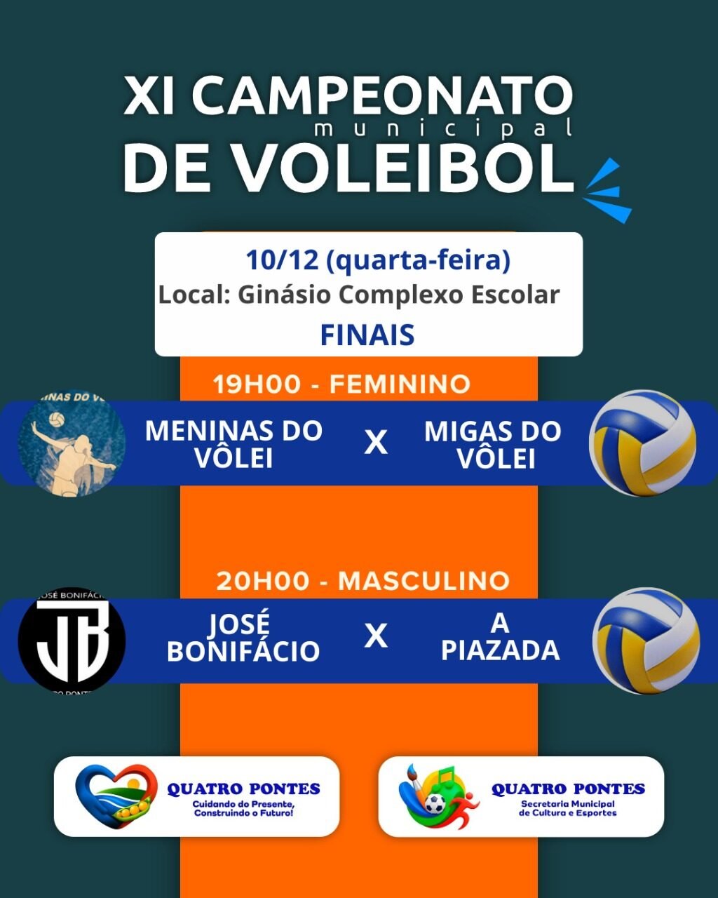 Quatro Pontes se prepara para sediar o ponto alto do voleibol municipal. Hoje, quarta-feira, 10 de dezembro, o Ginásio de Esportes do Complexo Escolar será palco das aguardadas finais do XI Campeonato Municipal de Voleibol. A noite promete grandes disputas e definirá os campeões das categorias feminina e masculina.