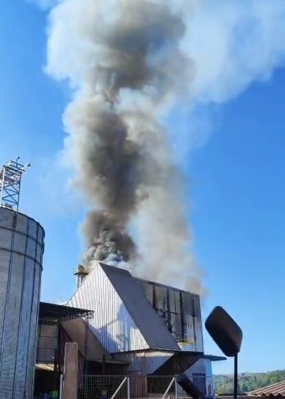 Na manhã desta sexta-feira (12), um incêndio atingiu a fábrica de ração da Agro Bickel, localizada no distrito de São Roque, em Marechal Cândido Rondon.