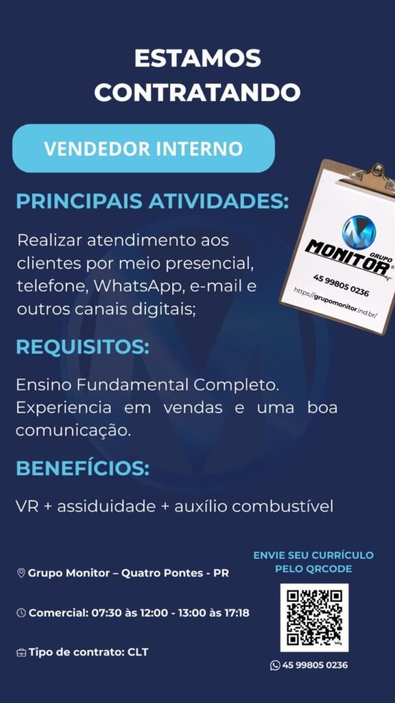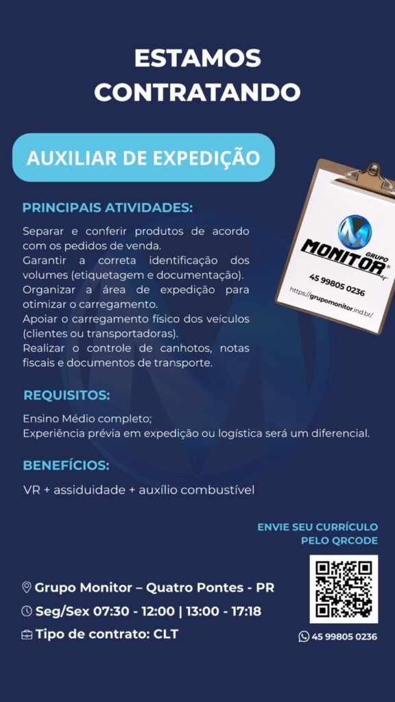 O Grupo Monitor, empresa instalada no município de Quatro Pontes, está com duas oportunidades de emprego abertas para reforçar sua equipe. As vagas disponíveis são para os cargos de auxiliar de expedição e vendedor interno, com contratação no regime CLT.