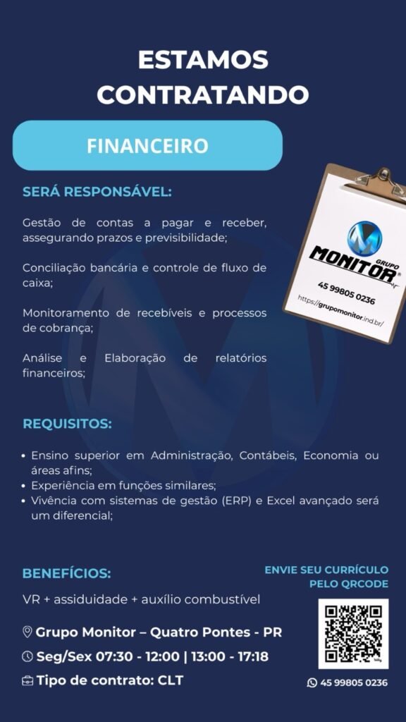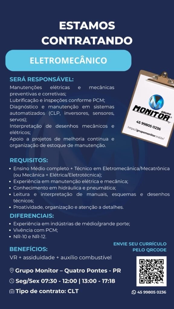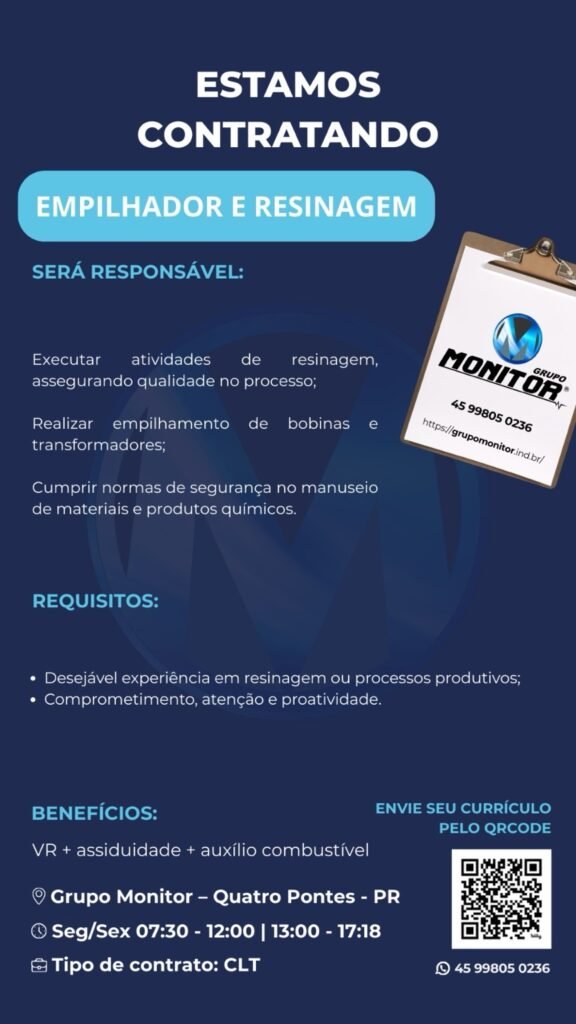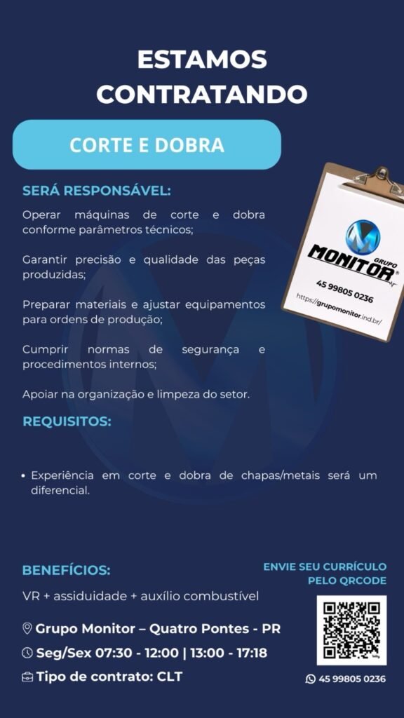 O Grupo Monitor, empresa referência no setor industrial e instalada em Quatro Pontes, está com novas oportunidades de emprego abertas em diferentes áreas. As vagas abrangem tanto funções operacionais quanto administrativas, oferecendo chances para profissionais com variados perfis e níveis de experiência.