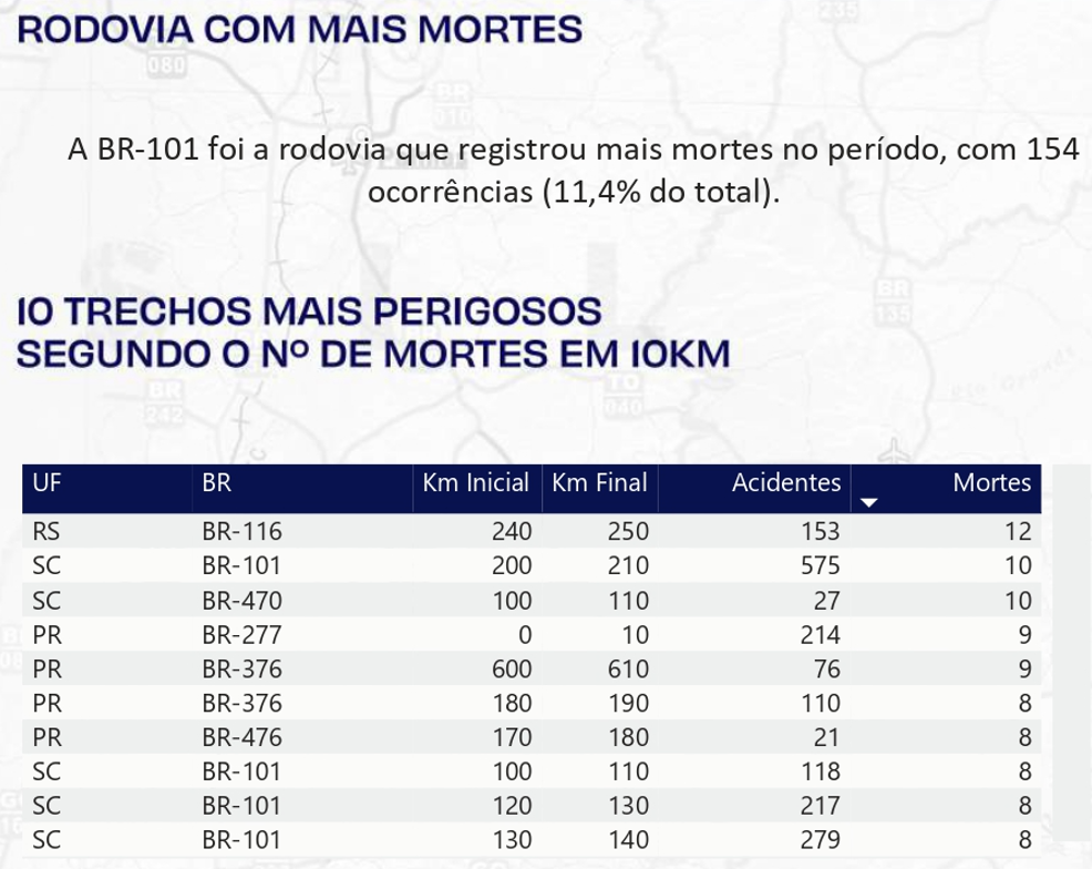 Entre todas as rodovias federais da região Sul, a BR-101 aparece com os maiores números tanto de acidentes quanto de mortes no período analisado.