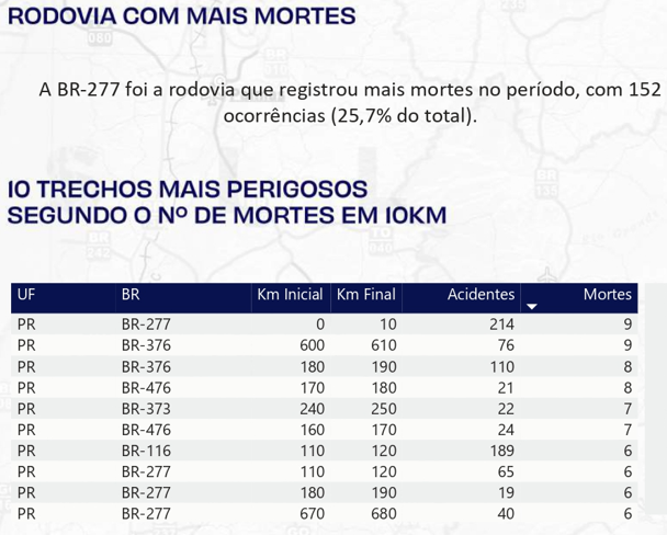 Os trechos paranaenses listados ocupam a 4ª, 5ª, 6ª e 7ª colocações no ranking do Sul. Entre eles está a BR-277, no trecho do km 0 ao km 10, em Paranaguá, com nove mortes registradas.