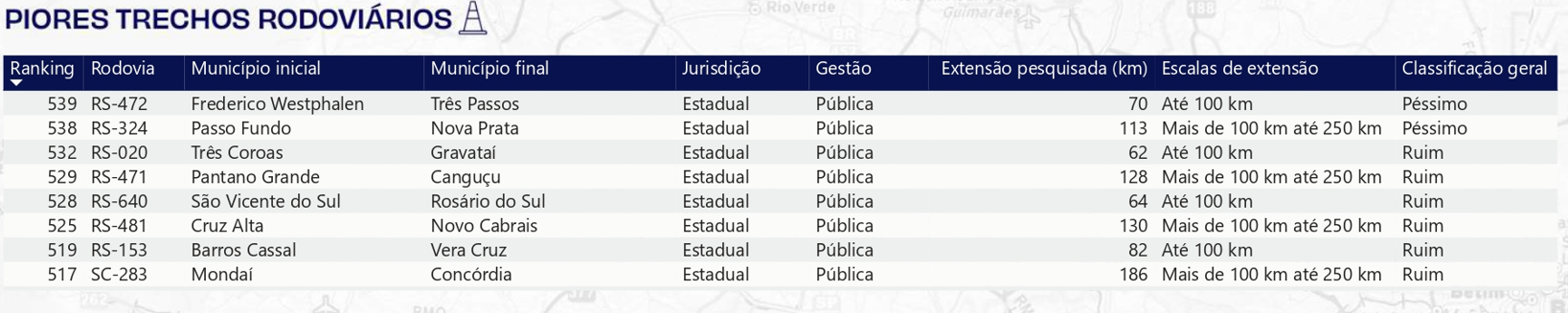 À frente do Paraná no ranking aparecem trechos localizados no Rio Grande do Sul e em Santa Catarina. O segmento mais letal do país é o da BR-116 entre os quilômetros 240 e 250, em território gaúcho, com 12 mortes.
