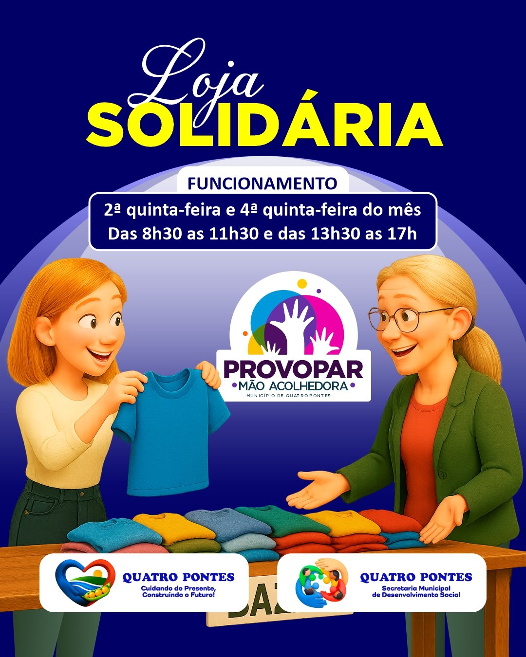 A Secretaria Municipal de Desenvolvimento Social, em parceria com o Provopar, inaugurou nesta quinta-feira, 14 de agosto, a Loja Solidária – Mão Acolhedora, em Quatro Pontes.