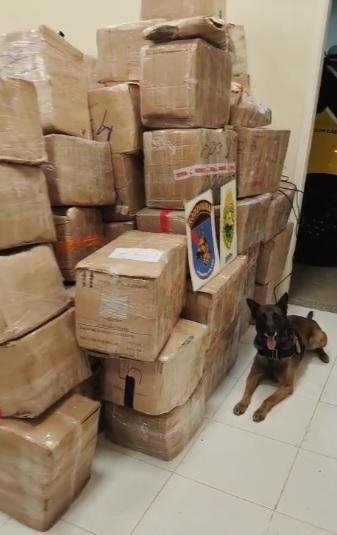 Durante a fiscalização, o cão policial Maximus, especializado na detecção de entorpecentes, foi empregado na vistoria e indicou a presença de drogas em um dos veículos. Ao abrir o compartimento de carga, as equipes encontraram diversas caixas contendo tabletes de maconha prensada, além de uma pequena quantidade de haxixe.