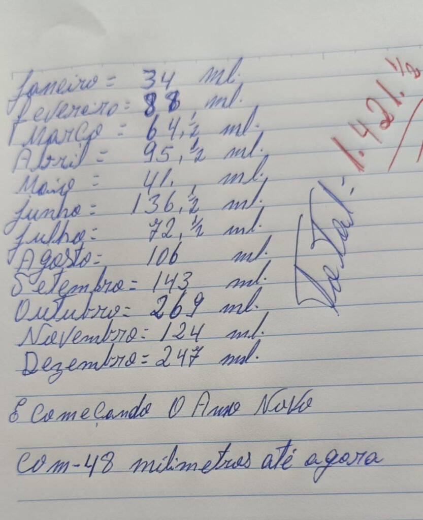Somados, os dados indicam um acumulado anual de aproximadamente 1.420 milímetros de chuva em 2025. Além disso, Genésio Orso já iniciou o acompanhamento do novo ano, registrando 48 milímetros de chuva até o momento.